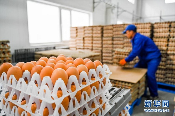 內(nèi)蒙古烏蘭察布市卓資縣十八臺鎮(zhèn)村民在當(dāng)?shù)亟痣u產(chǎn)業(yè)園區(qū)廠房內(nèi)分揀雞蛋(2020年3月26日攝)。新華社記者 連振 攝