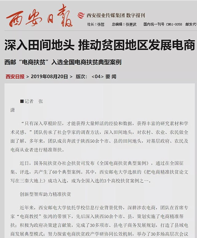 團(tuán)隊(duì)重視理論研究,以深厚的理論功底、豐碩的研究成果支撐扶貧實(shí)踐的開展。在中國(guó)管理科學(xué)、《人民郵電報(bào)》和新華網(wǎng)等核心期刊及報(bào)紙網(wǎng)站發(fā)表論文60多篇,出版專著7部,并與《新西部》期刊合作,開設(shè)西部電子商務(wù)發(fā)展專題欄目。同時(shí)積極向各級(jí)政府部門報(bào)送理論文章、決策咨詢建議,《以電子商務(wù)新動(dòng)能推進(jìn)陜西追趕超越》被《陜西省社會(huì)科學(xué)研究成果要報(bào)》采納,多篇研究報(bào)告被西安高新區(qū)國(guó)家電子商務(wù)示范基地采用做內(nèi)部交流。此外,承擔(dān)各級(jí)政府的項(xiàng)目以及委托咨詢項(xiàng)目,形成的研究報(bào)告對(duì)政府決策起到了重要的參考作用。