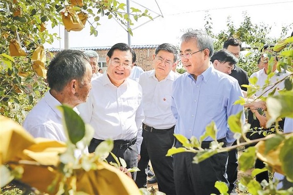 6月5日至7日,中共中央政治局委員、國(guó)務(wù)院扶貧開(kāi)發(fā)領(lǐng)導(dǎo)小組組長(zhǎng)胡春華在陜西省實(shí)地督導(dǎo)脫貧攻堅(jiān)工作。圖為他在延安市延川縣梁家河村考察山地蘋(píng)果種植情況。 記者 張辰攝
