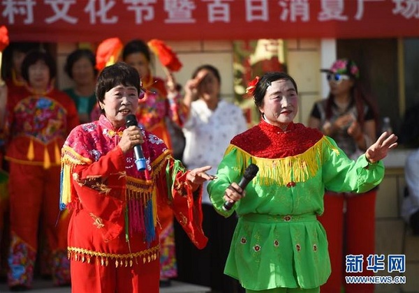 在內(nèi)蒙古鄂爾多斯市杭錦旗獨貴塔拉鎮(zhèn)芒哈圖村舉辦的“民生集市”上,民間文藝團體的演員在表演二人臺(6月8日攝)。新華社記者 彭源 攝