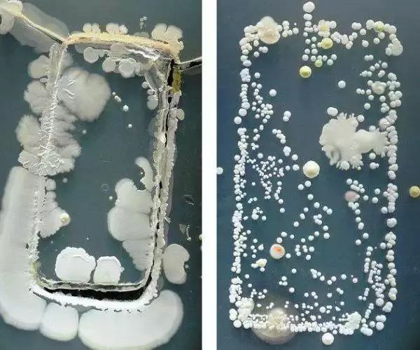 經(jīng)過了第一個24小時,大部分的培養(yǎng)皿中都長出了小如針尖,大如小米大小的菌落,但一部經(jīng)常被擦拭的手機培養(yǎng)皿中與之前并無區(qū)別,看似非常干凈。但在第二個24小時過后,之前看似干凈的培養(yǎng)皿中也未能幸免,同樣長出了很多肉眼可見的菌落,而之前針尖大小的菌落變成了米粒大小。