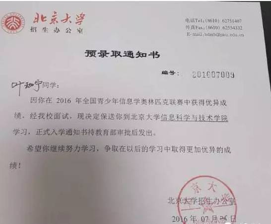 果不其然,北大在葉珈寧高一時(shí)就相中了他,與他簽約,表示可以降200分錄取他。高二時(shí)葉珈寧參加第33屆全國(guó)信息學(xué)奧賽,取得全國(guó)第14名的好成績(jī),獲得北京大學(xué)保送資格。“一般來(lái)說(shuō),全國(guó)前50名的孩子,北大清華是任選的?!庇峥Uf(shuō)。