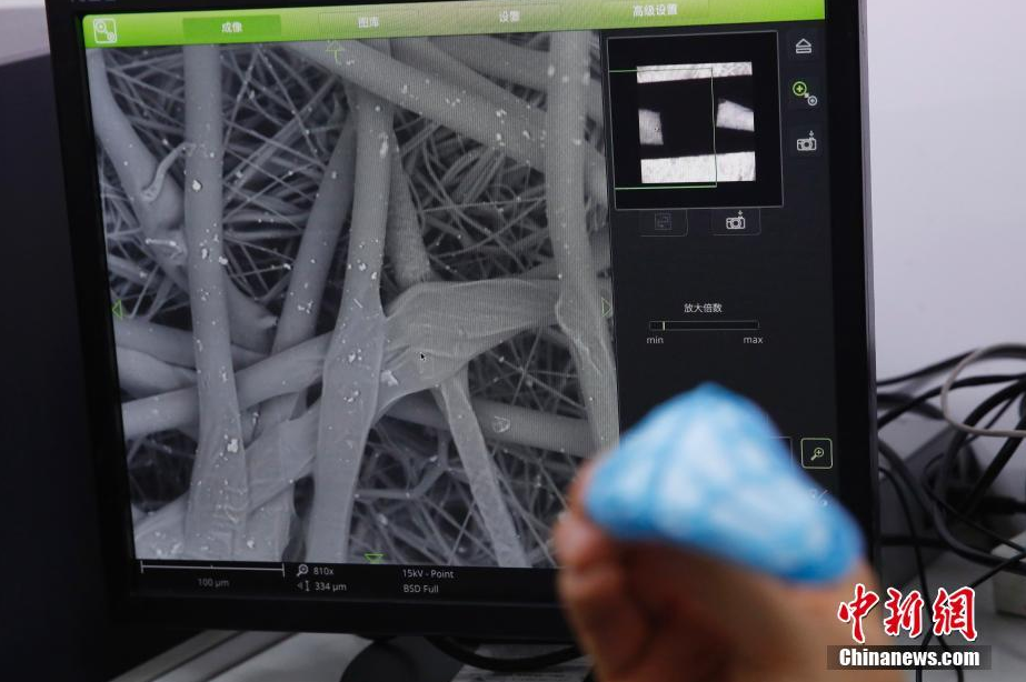 1月3日,北京化工大學(xué)高分子納米復(fù)合材料實(shí)驗(yàn)室劉勇教授通過(guò)臺(tái)式掃描電子顯微鏡,觀察近期使用后的防霾鼻罩濾芯上采集的霧霾顆粒,以及分析霧霾顆粒里面含有的各種元素。近日,北京持續(xù)霧霾天氣。中新社記者 韓海丹 攝