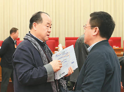 11月28日,莫言(左)與閻晶明交談。