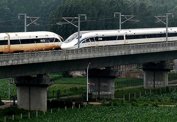 7月15日,兩輛中國標準動車組在鄭徐高鐵上以超過420公里的時速交會,這是世界最高速的動車組交會試驗。新華社記者 李安 攝