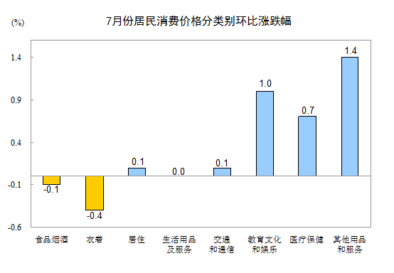 7月份,其他七大類價格環(huán)比五漲一降一平。其中,其他用品和服務(wù)、教育文化和娛樂、醫(yī)療保健、居住、交通和通信價格分別上漲1.4%、1.0%、0.7%、0.1%、0.1%;衣著價格下降0.4%;生活用品及服務(wù)價格持平。
