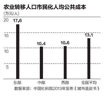 農(nóng)業(yè)轉(zhuǎn)移人口市民化等相關(guān)改革繞不開資金。根據(jù)2013年中國社科院發(fā)布的《城市藍(lán)皮書》,我國東、中、西部地區(qū)農(nóng)業(yè)轉(zhuǎn)移人口市民化的人均公共成本分別為17.6萬元、10.4萬元和10.6萬元,全國平均為13.1萬元/人。財(cái)政支持因此成為農(nóng)民工市民化關(guān)鍵一環(huán)。
