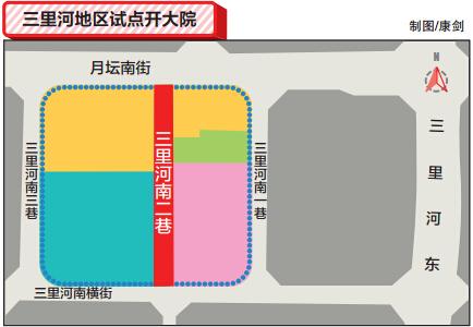 3月中旬,財(cái)政部等眾多機(jī)關(guān)單位扎堆的三里河地區(qū),一條5米寬的小巷——三里河南二巷被媒體報(bào)道為西城區(qū)的“拆墻”試點(diǎn)。根據(jù)當(dāng)時(shí)發(fā)布的新版規(guī)劃圖,這條阻礙南北向交通的5米小巷將會(huì)拓寬成一條18米寬的規(guī)劃道路,小巷東側(cè)一些低矮建筑將被拆除,以暢通整個(gè)街區(qū)的道路循環(huán)。