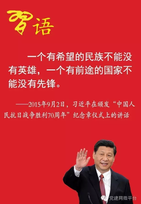 “一個有希望的民族不能沒有英雄,一個有前途的國家不能沒有先鋒?!绷?xí)近平總書記曾在多個場合表達對英雄的崇敬之情,努力推動全社會形成見賢思齊、崇尚英雄、爭做先鋒的良好氛圍。