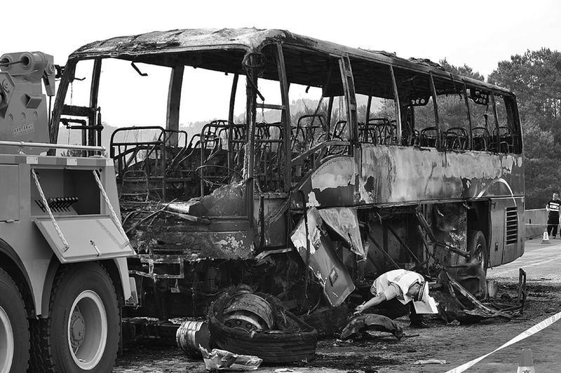 一段視頻顯示,大巴車已難以靠近,一名穿白色短袖的女子跑到車窗下,向已充斥黑煙的大巴車內(nèi)招手,疑似在呼喊車中的人;車旁還有一名男子褲子疑被引燃燒,有人正幫他撲火。視頻顯示,起火的大巴車最終燒得面目全非,只剩一副架子,損壞程度車頭比車尾嚴(yán)重。