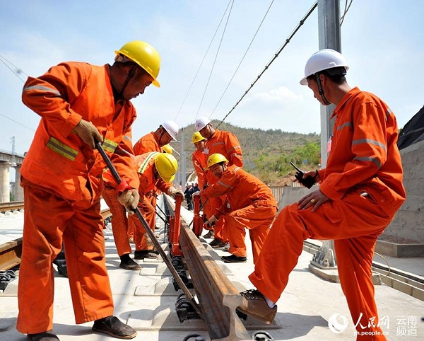 4月28日10時18分,位于云南省昆明市呈貢區(qū)的滬昆高鐵云南段大新冊大橋與黃連山二號隧道接軌點彩旗飛揚,中鐵三局鋪軌機牽引的最后一組長500米、分別重30噸的長鋼軌在接軌點落地后,施工人員迅速擰緊長鋼軌的扣件螺栓,這標志著滬昆高鐵云南段全線鋪通,云南將邁入高鐵時代,以“四縱四橫”為主骨架的中國高鐵網(wǎng)也將全部投入運營。
