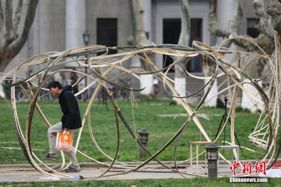 資料員:3月23日,大學(xué)生們在東南大學(xué)校園內(nèi)搭建一個(gè)個(gè)造型獨(dú)特的“竹構(gòu)”作品,倡導(dǎo)回歸自然的綠色環(huán)保生活。中新社 記者 泱波 攝