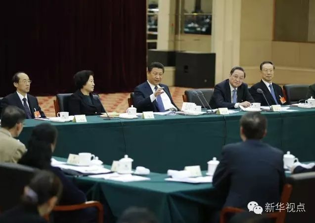 2015年3月4日,習(xí)近平看望出席全國政協(xié)十二屆三次會(huì)議的民革、臺(tái)盟、臺(tái)聯(lián)委員,聽取委員們的意見和建議,并發(fā)表重要講話。他指出,兩岸同胞要總結(jié)兩岸關(guān)系和平發(fā)展的經(jīng)驗(yàn),精心維護(hù)兩岸關(guān)系和平發(fā)展成果。 新華社記者鞠鵬攝