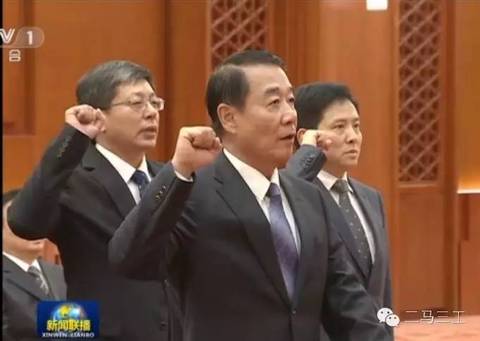 報(bào)道指出,國(guó)歌唱畢,領(lǐng)誓人、新任命的全國(guó)人大財(cái)政經(jīng)濟(jì)委員會(huì)副主任委員劉源走到宣誓臺(tái)前,將左手撫按在憲法上,右手舉拳,宣讀誓詞。新任命的全國(guó)人大常委會(huì)法制工作委員會(huì)副主任王超英、張勇、許安標(biāo),全國(guó)人大常委會(huì)預(yù)算工作委員會(huì)副主任劉偉、朱明春等人并排站在領(lǐng)誓人身后,舉起右拳,跟誦誓詞。