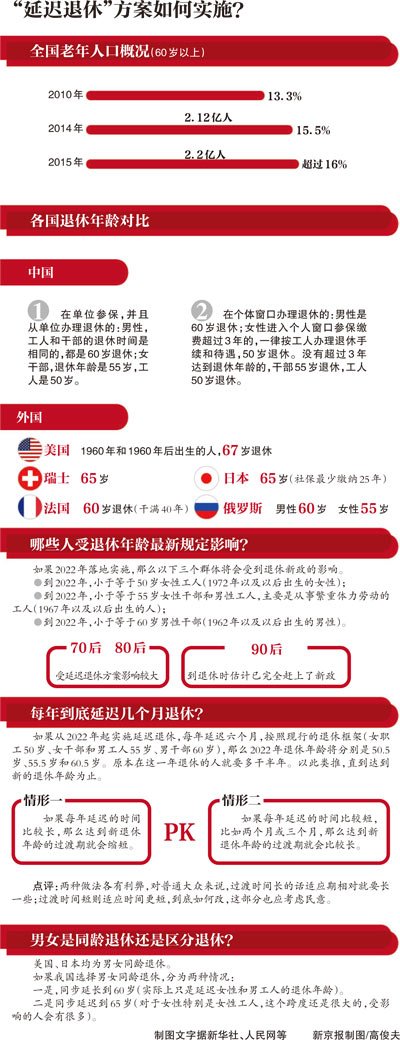 尹蔚民還透露了方案“小步慢走、漸進到位”的考慮。每年推遲幾個月的時間,經過一個相當長的時間再達到法定退休的目標年齡。