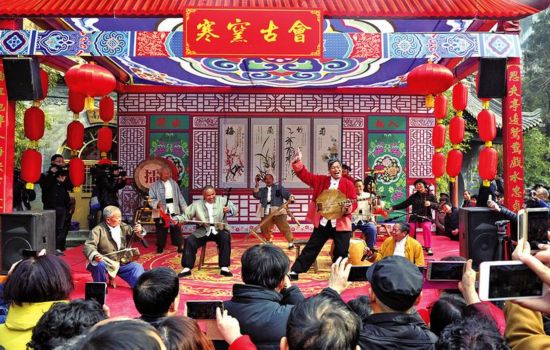 2月9日,大年初二,西安曲江寒窯遺址公園寒窯古會(huì)迎來參加完央視春晚歸來的華陰老腔原班人馬,藝術(shù)家們不辭辛勞,風(fēng)塵仆仆從北京趕回西安,又為三秦父老獻(xiàn)上猴年的首場(chǎng)演出。記者 劉強(qiáng) 攝