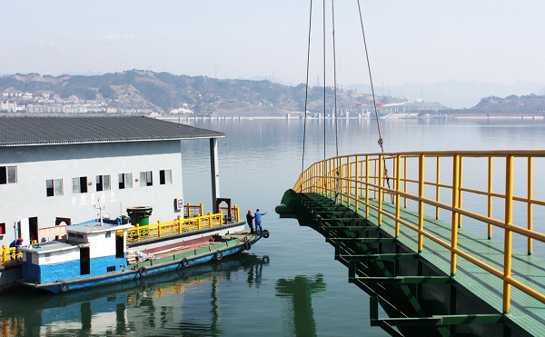 2016年2月16日,三峽壩前首座泵船式取水泵站搭建完成。這種取水泵站由船舶和萬向活絡(luò)接搖臂輸水管組成,會隨著三峽庫區(qū)水位的漲落而自由移動,解決了纜車取水移動頻繁耗時(shí)長的問題,為三峽庫區(qū)移民生產(chǎn)生活用水提供保障。