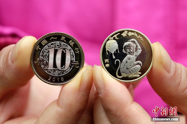 1月16日,2016年猴年賀歲紀(jì)念幣正式發(fā)行,北京市民早上在銀行門口排隊(duì)兌換。猴年普通紀(jì)念幣正面刊“中國人民銀行”、“10元”、漢語拼音字母“SHIYUAN”及年號(hào)“2016”,底紋襯以團(tuán)花圖案。背面主景圖案為一只傳統(tǒng)裝飾造型的猴子,抬手遠(yuǎn)眺;其上方為桃形花燈和梅花圖案,幣面左側(cè)刊“丙申”字樣。