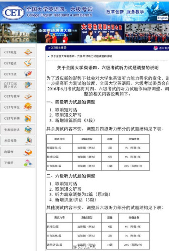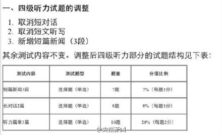 全國大學英語四、六級考試網(wǎng)站日前發(fā)布消息,稱為進一步提高聽力測試的效度,2016年6月考試起將對四、六級考試的聽力試題作局部調(diào)整:已經(jīng)使用多年的的短對話和短文聽寫題型將退出歷史舞臺,取而代之的是新聞聽力和學術(shù)講座。(央視記者 馬力)