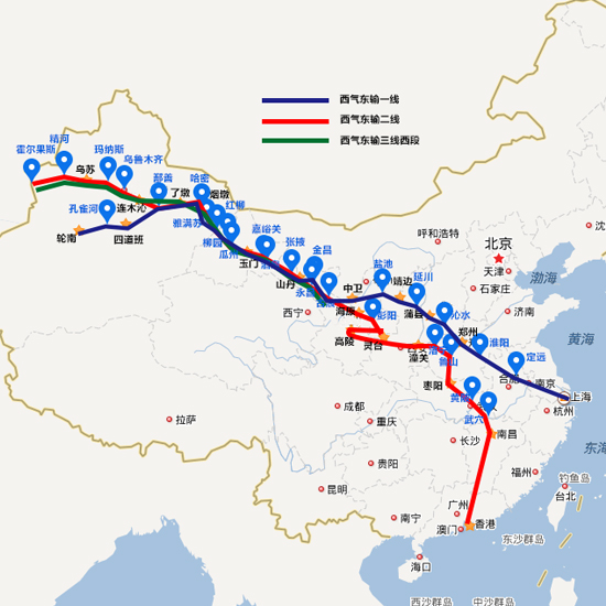 圖中藍色地名為GE為西氣東輸?shù)谝?、二、三線(西段)工程所建的壓縮站
