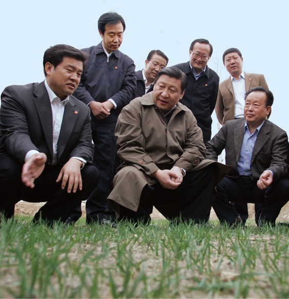 2008年4月8日,習(xí)近平同志在寧夏回族自治區(qū)黨委、政府主要負(fù)責(zé)同志陪同下深入青銅峽陳袁灘鎮(zhèn)袁灘村田間地頭了解春耕生產(chǎn)。