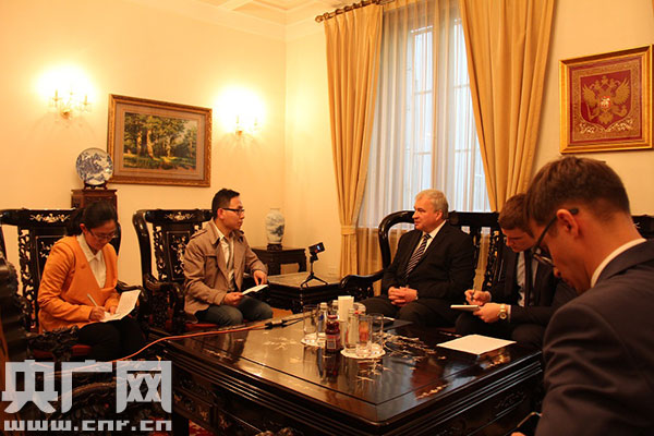 俄羅斯駐華大使杰尼索夫正在接受中央人民廣播電臺(tái)記者專訪