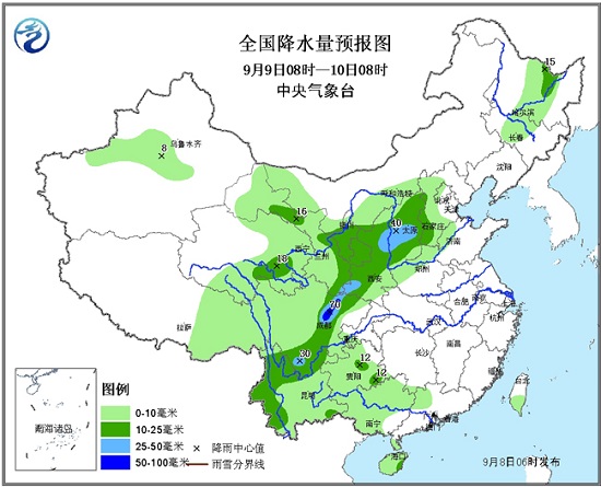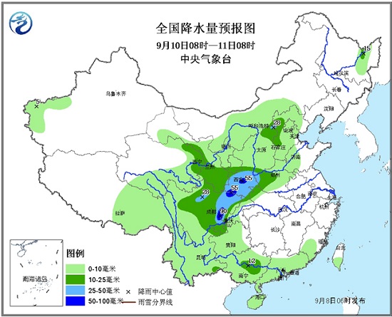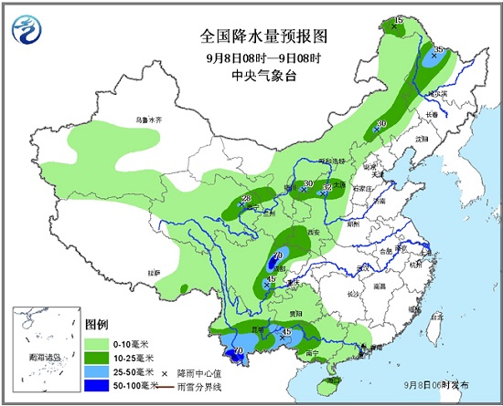 9日08時至10日08時,西北地區(qū)東部、青海東南部、甘肅中部、華北中西部、四川盆地西部、川西高原南部、云南西部和北部、貴州東部、黑龍江東北部等地有中到大雨,其中,四川盆地西北部等地的部分地區(qū)有暴雨(50~70毫米);上述局地還將伴有短時強降水等強對流天氣。