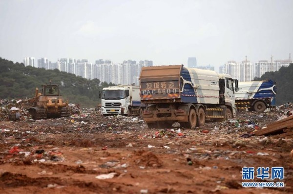 位于五象嶺的城南垃圾填埋場(chǎng)是廣西南寧市唯一一個(gè)垃圾填埋場(chǎng)。今年入夏以來(lái),城南垃圾填埋場(chǎng)平均每天約有440輛次垃圾車進(jìn)出填埋場(chǎng),日填埋量突破3000噸已成為常態(tài),最高達(dá)3600噸,約為填埋場(chǎng)設(shè)計(jì)的日處理能力1200噸的3倍。南寧市除少量餐廚垃圾外,超過(guò)95%的生活垃圾都被直接送到城南垃圾填埋場(chǎng)進(jìn)行填埋。目前,城南垃圾填埋場(chǎng)已不堪重負(fù)幾近滿場(chǎng),如新的填埋場(chǎng)或垃圾處理方式仍未有著落,未來(lái)兩年南寧或?qū)⒚媾R“垃圾圍城”。新華社記者周華攝