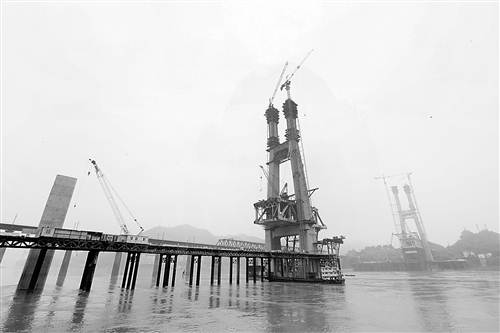 8月10日11時,渝黔鐵路新線新白沙沱長江大橋首對斜拉索掛設成功。該大橋于2013年開建,有望于2016年春節(jié)前合龍。