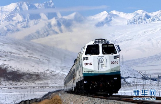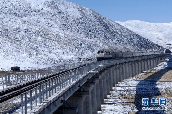 從拉薩開(kāi)往內(nèi)地的火車駛過(guò)藏北雪山(2006年10月25日攝)。新華社記者覺(jué)果攝