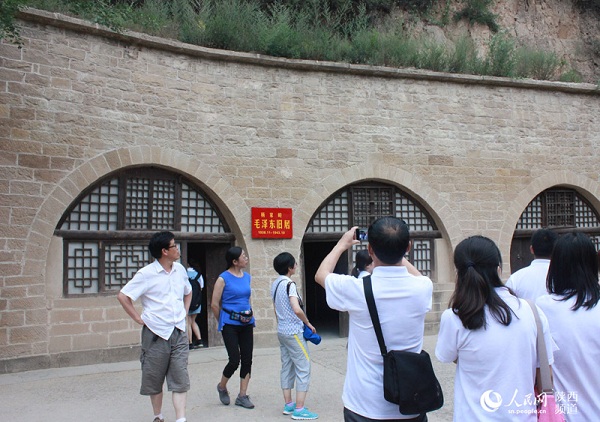 隨后,網(wǎng)媒團在講解員的帶領下,參觀了楊家?guī)X革命舊址。楊家?guī)X是中共中央領導在1938年11月至1947年3月期間的住處。這里曾進行過轟轟烈烈的大生產(chǎn)運動、整風運動,現(xiàn)有中共中央七大會址、延安文藝座談會會址可供參觀。在會址后面的小山坡上,散落著一排窯洞,那是毛澤東、周恩來、朱德、劉少奇等領導人當年的住所。