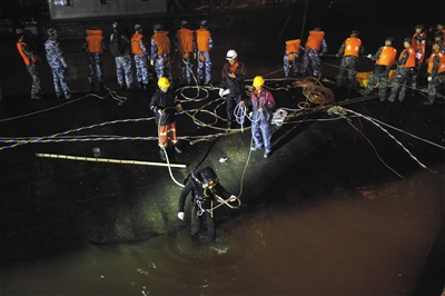 6月2日10時,當(dāng)救援人員趴在沉船裸露的船底敲擊時,在船中和船尾,共得到3名生還者的回應(yīng)。但在潛水員到來之前,救援者不敢隨便切割船體。終于,在事故發(fā)生約14個小時后,第一批13名潛水員來到現(xiàn)場。