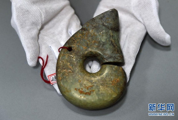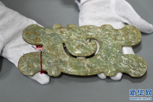 工作人員向記者展示追回的文物——紅山文化勾云形玉佩(4月10日攝)。