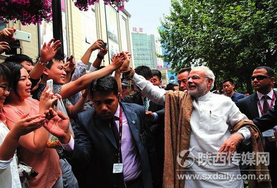 車隊(duì)經(jīng)過(guò)西安小寨十字時(shí),路邊擠滿了熱情的西安市民,莫迪總理特地停車走近市民,向他們揮手致意。