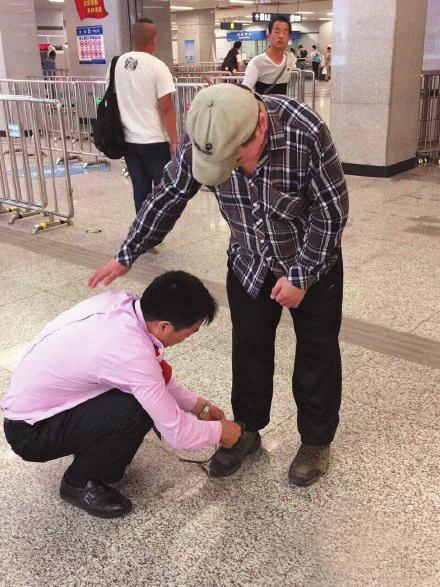 說到系鞋帶的事,37歲的王海航靦腆地說:“其實(shí)這不值一提,對(duì)于每個(gè)站務(wù)人員,遇到類似的情況都會(huì)相助的?!痹谟浾叩淖穯栂?,王海航講述了當(dāng)時(shí)的情景。