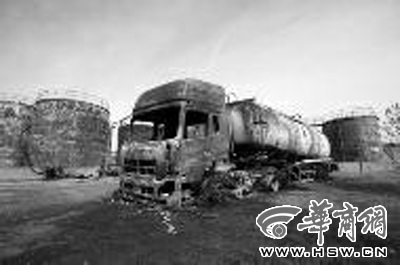 事發(fā)地點(diǎn)位于煙霞鎮(zhèn)袁坡村,昨日上午10時(shí)許,華商報(bào)記者趕到現(xiàn)場(chǎng)看到,在占地近3000平米的廠區(qū)內(nèi),一輛油罐車被燒得面目全非,車胎全部被燒毀,駕駛室及車窗也只剩下鐵架。而距失火罐車不足10米處,就有7個(gè)儲(chǔ)油罐?!按蠡鹗窃诹璩苛泓c(diǎn)30分左右發(fā)生的,火苗有十多米高,還伴有‘砰、砰’的爆炸聲?!备浇迕裾f,“很多人由于擔(dān)心引燃廠區(qū)內(nèi)儲(chǔ)油罐,半夜起床拖家?guī)Э诙愕缴缴??!?