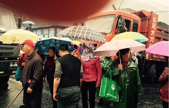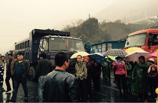 4月18日下午,陜西韓城,多名拉煤司機(jī)被困在韓城市桑樹(shù)坪鎮(zhèn)雷嶺村,當(dāng)?shù)卮迕褡钄r了他們的去路。在雨中,拉煤司機(jī)拉出橫幅并下跪求村民放行。據(jù)了解,當(dāng)?shù)赜幸粋€(gè)礦井,最近一個(gè)公司的車隊(duì)通過(guò)招標(biāo)后和礦井簽訂了協(xié)議,負(fù)責(zé)運(yùn)輸煤礦。可是當(dāng)?shù)氐拇迕裾J(rèn)為,車隊(duì)較低的價(jià)格影響他們?nèi)サV井拉活兒,所以就讓一些老人和婦女堵著路,不讓車隊(duì)經(jīng)過(guò)拉煤。目前,經(jīng)過(guò)民警做工作,村民已經(jīng)離去,拉煤車輛均已逐一通過(guò)。圖為司機(jī)下跪現(xiàn)場(chǎng)。