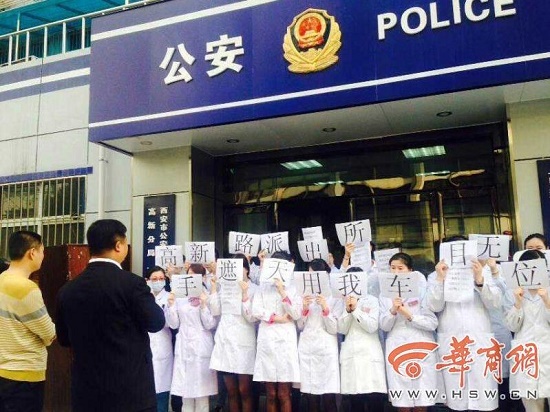 “停車場(chǎng)保安不會(huì)變通,民警劉某做法也欠妥”。該所民警告訴華商記者,首先能肯定的是,民警劉某并未打人。其次,醫(yī)護(hù)人員堵住派出所大門的舉動(dòng),是因?yàn)獒t(yī)院停車場(chǎng)只對(duì)該院患者開放,同時(shí)醫(yī)院職工的車輛不得進(jìn)入。出了這件事后,該院職工想以這種“堵門”形式,贏得各自停車的權(quán)利。