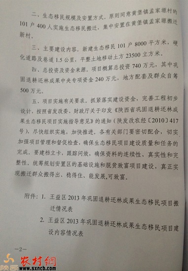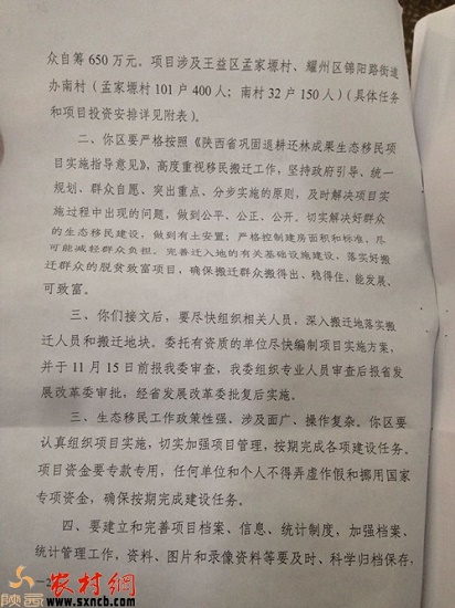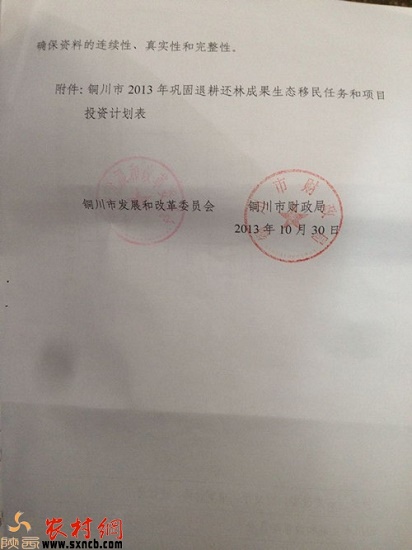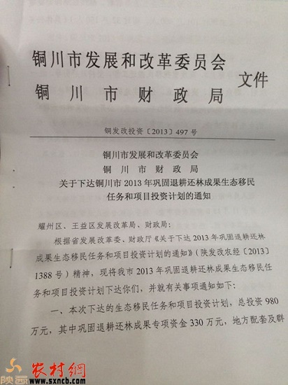 隨后,記者在王益區(qū)發(fā)改局提供了銅川市發(fā)展和改革委員會同銅川市財政局聯(lián)合下發(fā)的文件《關于下達銅川市2013年鞏固退耕還林成果生態(tài)移民任務和項目投資計劃的通知》中看到,文件中明確要求:要按期完成各項建設任務,項目資金要??顚S?,任何單位和個人不得弄虛作假和挪用國家專項資金,確保按期完成建設任務。