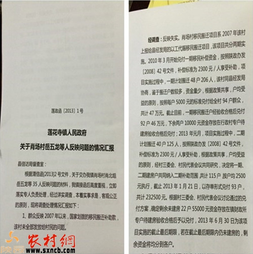 隨后,記者來到華縣蓮花寺鎮(zhèn)政府采訪,該鎮(zhèn)黨政辦公室趙主任得知記者是因肖場村移民搬遷的事情而來時,這樣說道:“這個村子在沒有搬遷前是個很安靜的村子,搬遷后卻成了有名的上訪村,我都已經(jīng)去北京接訪兩次了。現(xiàn)在已經(jīng)過去很長時間了,有些情況我也記不清楚了,我讓人把當時的材料拿來你們一看便知?!?