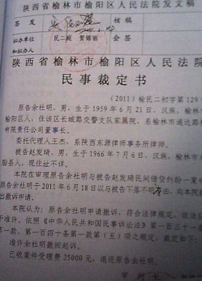 趙發(fā)琦質(zhì)問:榆陽(yáng)區(qū)法院怎么能在2010年12月29日就拿到2011年7月1日的文書并進(jìn)行修改?因此他開始質(zhì)疑“第129號(hào)”案是偽造而來(lái)。律師查閱案卷后發(fā)現(xiàn),榆陽(yáng)區(qū)人民法院訴訟收費(fèi)專用票據(jù)也后來(lái)補(bǔ)開的,于是出現(xiàn)了法院案件受理日期早于簽收案件起訴狀日期的矛盾。