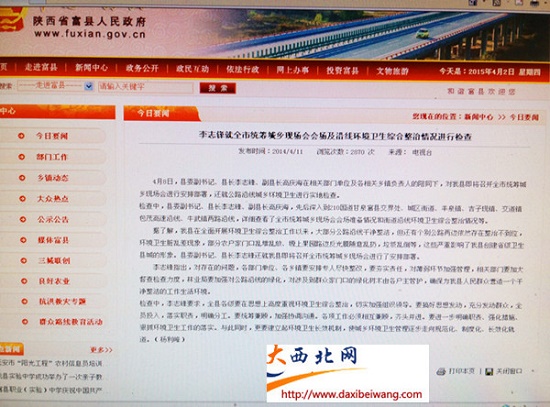 據(jù)2014年4月11日富縣政府網(wǎng),“2014年4月8日,富縣縣長李志鋒、副縣長高慶海在相關(guān)部門及各相關(guān)鄉(xiāng)鎮(zhèn)負責(zé)人的陪同下,對該縣即將召開的全市統(tǒng)籌城鄉(xiāng)現(xiàn)場會進行安排部署,還就公路沿線環(huán)境衛(wèi)生進行實地檢查,指出部分鄉(xiāng)鎮(zhèn)公路沿線環(huán)境衛(wèi)生臟亂差,反光膜隨意亂扔,垃圾亂倒等問題,并提出了整改要求”。