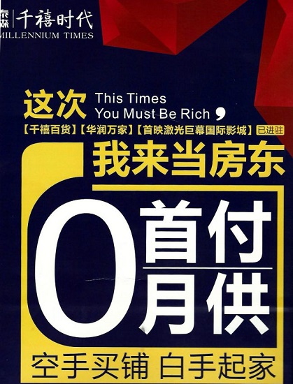 連日來,寶雞市泰森地產(chǎn)“千禧時(shí)代”商業(yè)樓盤項(xiàng)目在市區(qū)多處散發(fā)廣告?zhèn)鲉?,宣稱:千禧時(shí)代商業(yè)樓盤,“千禧百貨、華潤(rùn)萬家、首映激光巨幕國際影城已進(jìn)駐”、“0首付0月供,空手買鋪,白手起家”等。