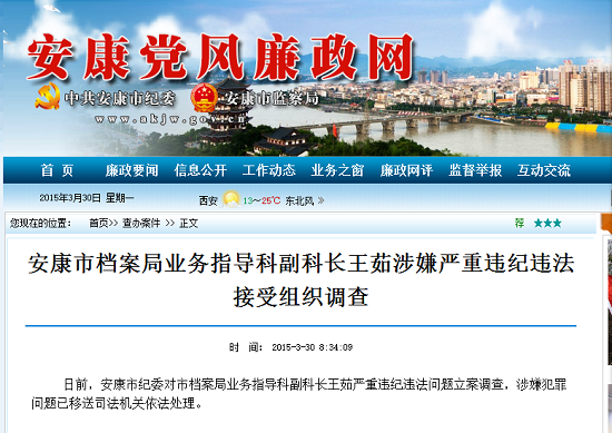 安康市檔案局業(yè)務(wù)指導科副科長王茹涉嫌嚴重違紀違法接受組織調(diào)查。日前,安康市紀委對市檔案局業(yè)務(wù)指導科副科長王茹嚴重違紀違法問題立案調(diào)查,涉嫌犯罪問題已移送司法機關(guān)依法處理。(安康市紀委)