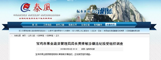據(jù)秦風(fēng)網(wǎng)消息,寶雞市果業(yè)蔬菜管理局局長(zhǎng)黃維敏涉嫌違紀(jì),正在接受組織調(diào)查。