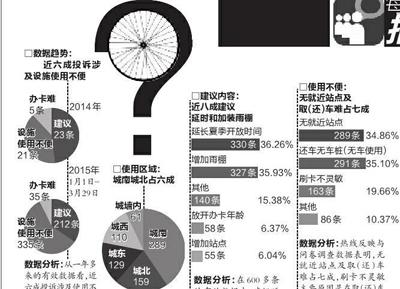 數(shù)據(jù)分析:從一年多來的有效數(shù)據(jù)看,近六成投訴涉及使用不便,而市民各類建議以及設(shè)施使用不便占到九成。其中市民建議主要包括:增設(shè)雨棚、增設(shè)站點(diǎn)、延長(zhǎng)時(shí)間等。設(shè)施使用不便主要包括:未投入使用、刷卡不靈敏、斷電以及取(還)車難等