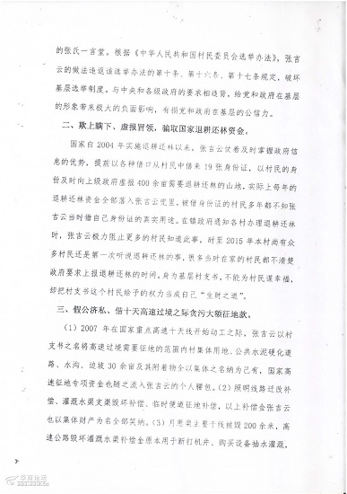 國家自2004年實施退耕還林以來,張吉云仗著及時掌握政府信息的優(yōu)勢,提前以各種借口從村民中借來19張身份證,以村民的身份及時向上級政府虛報400余畝需要退耕還林的山地,實際上每年的退耕還林資金全部落入張吉云兜里,被借身份證的村民多年都不知張吉云當時借自己身份證的真實用途。在鎮(zhèn)政府通知各村辦理退耕還林時,張吉云極力阻止更多的村民知道此事,時至2015年本村尚有眾多村民還是第一次聽說退耕還林的事,很多當時在家的村民都不清楚政府要求上報退耕還林的時間。身為基層村支書,不能為村民謀幸福,卻把村支書這個村民給予的權(quán)力當成自己“生財之道”。