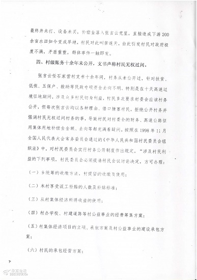 張吉云任石家營村支書十余年間,村務(wù)從未公開過,針對扶貧、低保、五保戶、救助等民政專項資金去向不明,特別是在十天高速過境征地期間,涉及眾多村民切身利益,村民多次要求村委會應(yīng)該村務(wù)公開,但每次張吉云均以各種理由、借口搪塞村民,拒絕公開村務(wù)并強調(diào)村民無權(quán)過問村務(wù)的事,導(dǎo)致村民對村委會的財務(wù)、高速公路征用集體用地補償金金額、去向等都充滿著疑問。按照在1998年11月全國人民代表大會常務(wù)委員會通過的《中華人民共和國村民委員會組織法》中,對村民委員會實行村務(wù)公開制度作出規(guī)定。“涉及村民利益的下列事項,村民委員會必須提請村民會議討論決定,方可辦理: