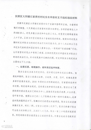 安康市漢濱區(qū)大同鎮(zhèn)石家營村村民實名舉報村支書違紀違法材料
