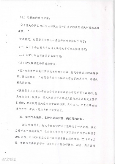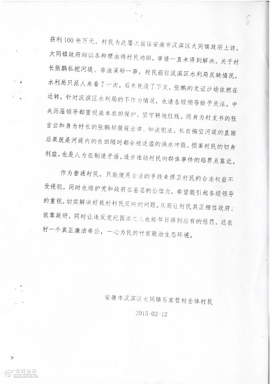 2013年3月份,村支書張吉云的兒子張鵬為了一己之利,在未辦理開采手續(xù)的情況下,私自將石家營村月河河堤外的防護林砍伐了2000余根,讓1000米左右的河堤直接暴露在洪水面前。2013年6月份,張鵬私自將石家營村1000余米河堤全部掏空,淘金、賣沙直接獲利100余萬元。村民為此屢次前往安康市漢濱區(qū)大同鎮(zhèn)政府上訪,大同鎮(zhèn)政府均以各種理由將村民勸回,事情一直未得到解決。關(guān)于村長張鵬私挖河堤、非法采砂一事,村民前往漢濱區(qū)水利局反映情況,水利局只派人來看了一次,后來就沒了下文,張鵬的無證沙場依然在運轉(zhuǎn),針對漢濱區(qū)水利局的不作為情況,也請各級領(lǐng)導(dǎo)給予關(guān)注。中央歷屆領(lǐng)導(dǎo)都重視基本農(nóng)田保護,堅守耕地紅線,而身為村支書的張吉云和身為村長的張鵬卻藐視法律、知法犯法,私自掏空河堤的直接后果就是河堤內(nèi)的良田隨時都會被泛濫的洪水沖毀,損害村民的切身利益,也是人為在制造矛盾,逐步推動村民向群體事件的臨界點靠近。